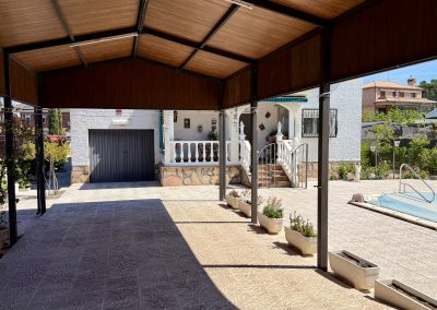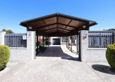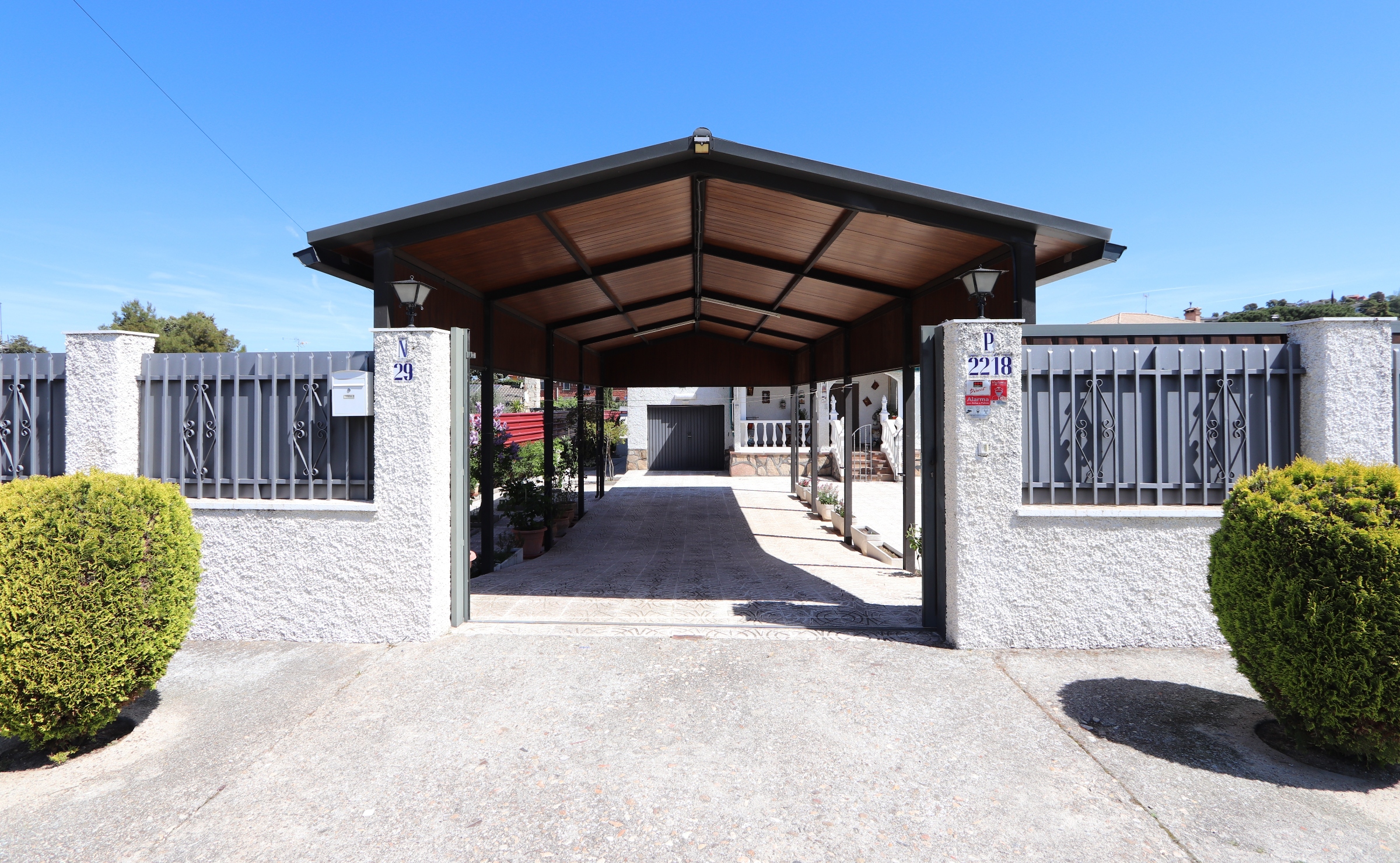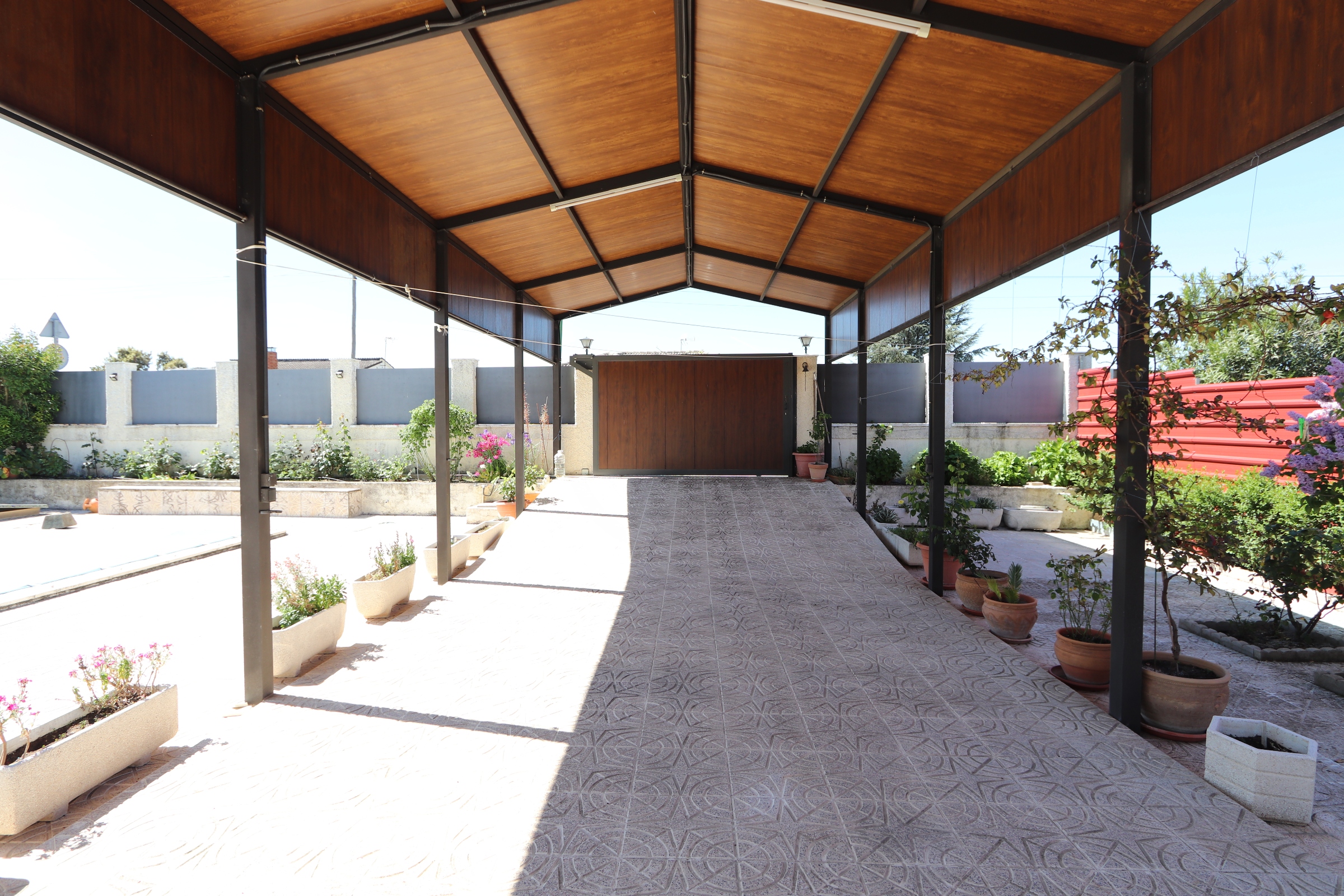 Magnifica pérgola cubriendo la entrada de vehículos.