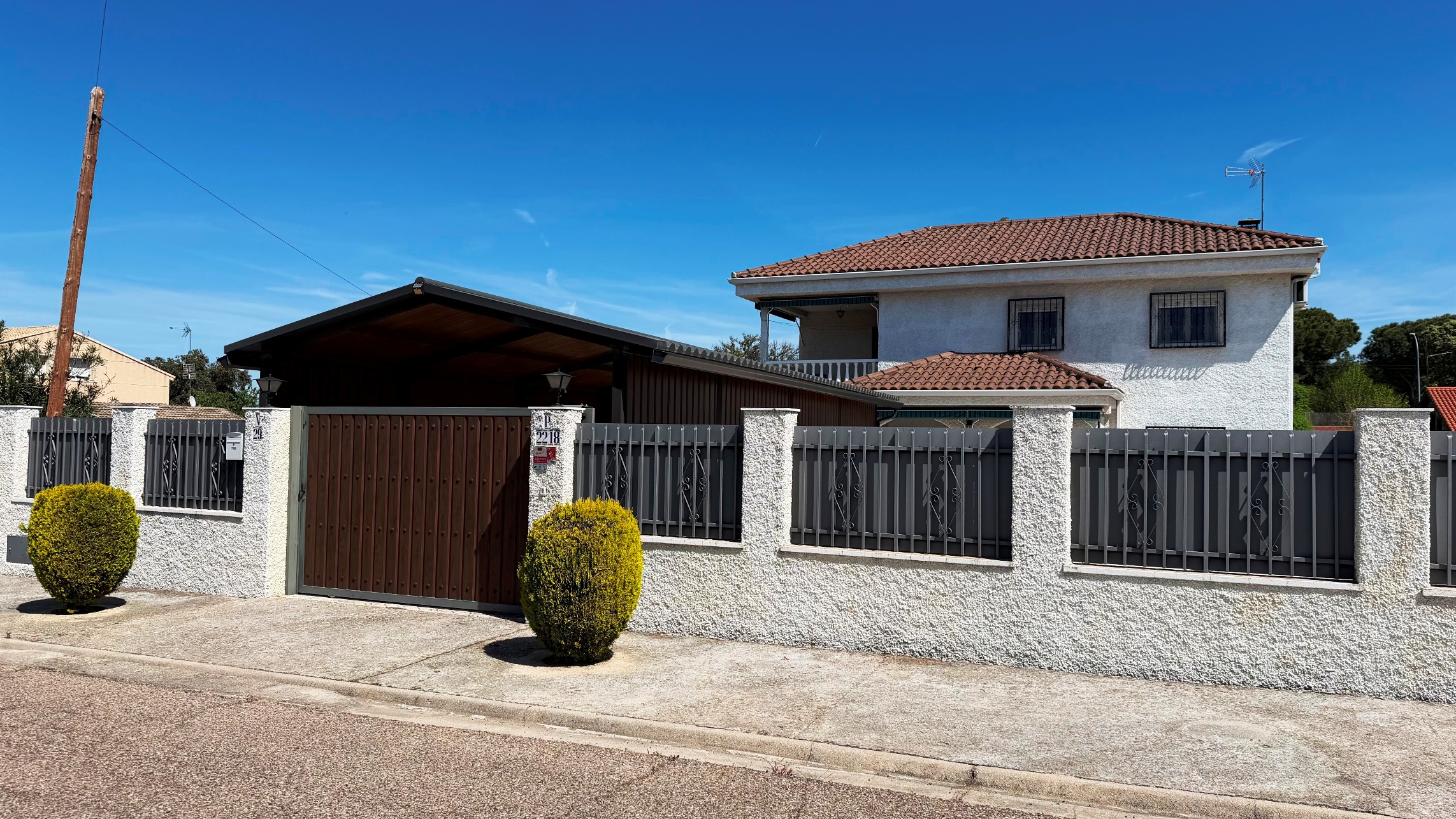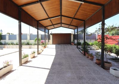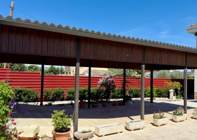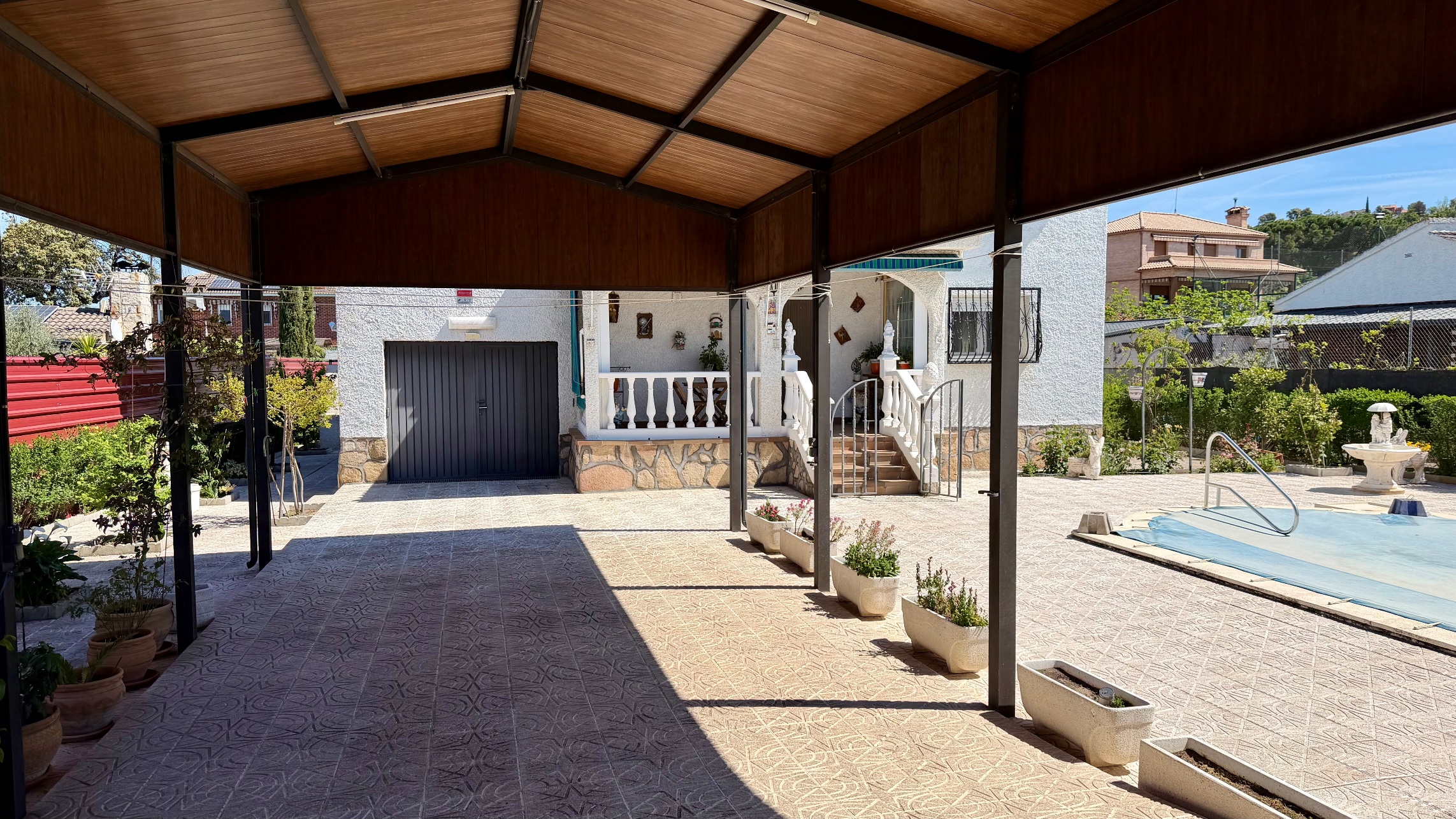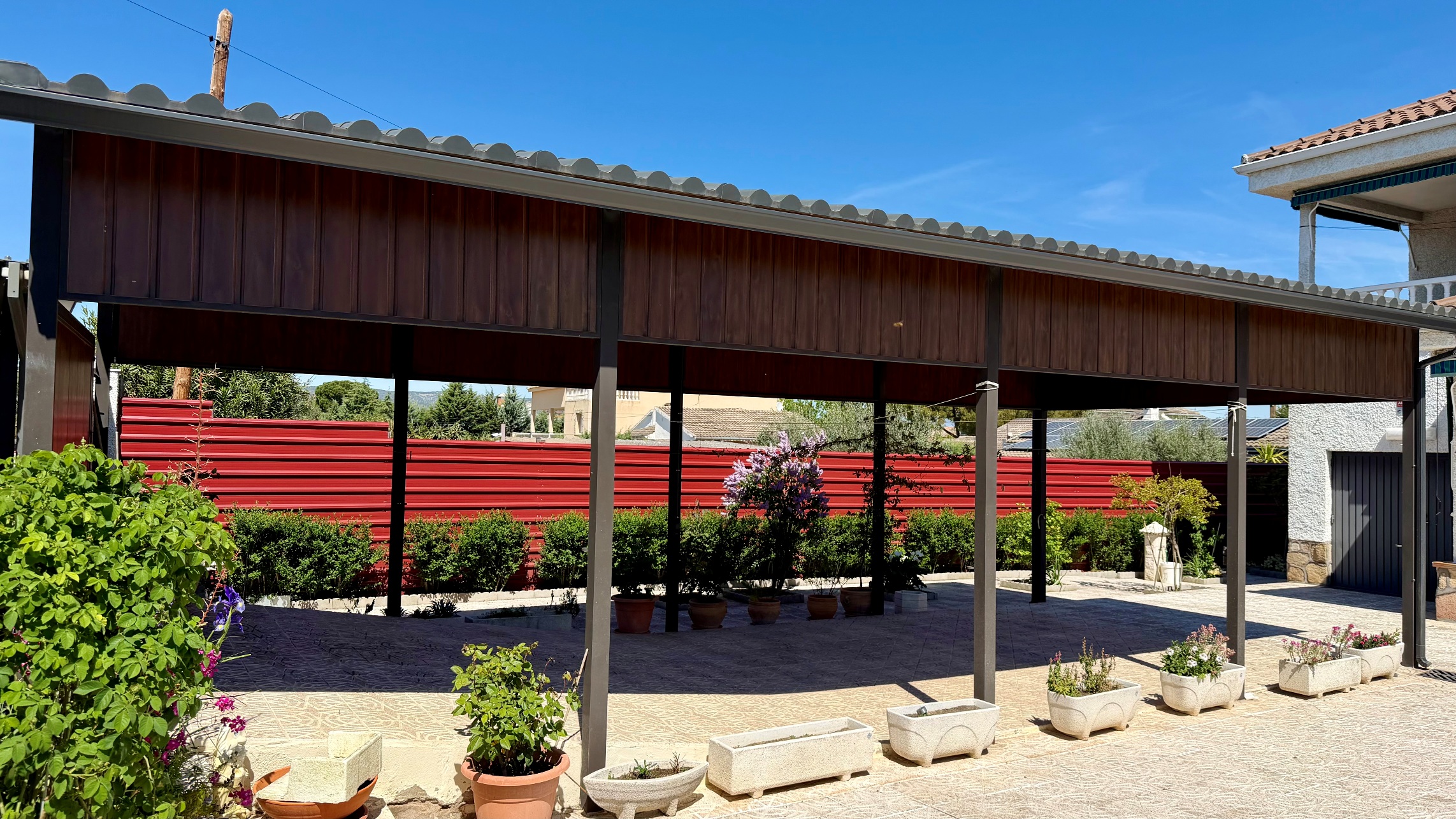 Magnifica pérgola cubriendo la entrada de vehículos.